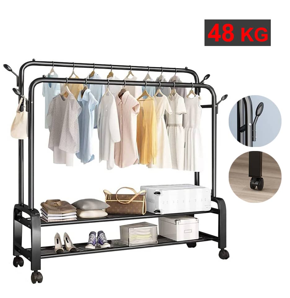 مساحة كبيرة : يتميز ستاند الملابس الجديد من فيوتشر بالسعة العالية جدا ، بسبب وجود 2 لاين فولاذي لتعليق الملابس بالإضافة لوجود رفوف سفلية عدد 2 لاستثمار أمثل للمساحة !